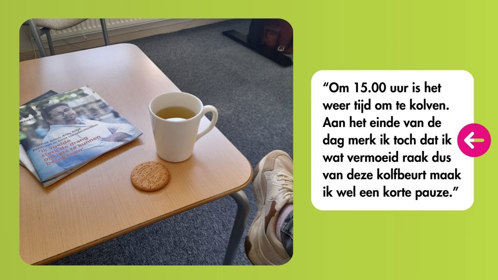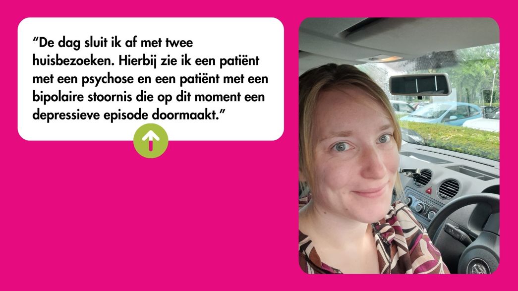 Om 15.00 uur is het weer tijd om te kolven. Ze merkt dat de energie aan het einde van de dag wat afneemt. Dus: even een ingelast pauzemomentje. Anne sluit de dag af met huisbezoeken: bij een patiënt met een psychose en bij een patiënt met een bipolaire stoornis die nu middenin een depressieve episode zit. Dat zijn soms best intense bezoeken.