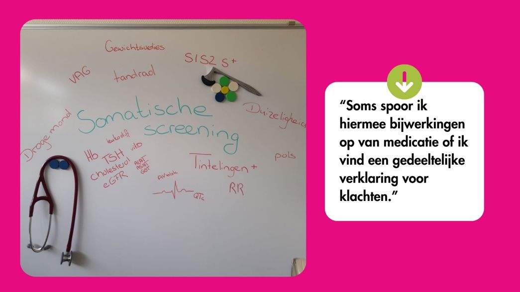 De dag begint met de overdracht: wat speelt er en welke huisbezoeken staan gepland? Rond 9.00 uur is het tijd voor de eerste kolfsessie, waarna Anne patiënten ziet op de poli voor somatische screening. Denk aan anamnese, lichamelijk onderzoek, bloedonderzoek en soms een ECG.